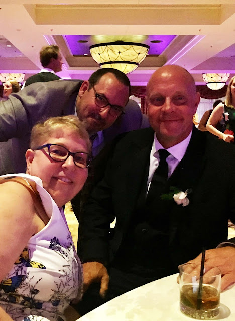 And here is my extended family. (And my bra strap too-eeks). That's me, my cousin and my brother. My brother is the father of the groom. The three of us spent a lot of time together as kids, and are the only 3 of this side of the family really left (of course minus our kids).
